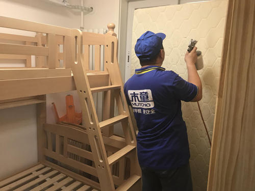 李女士主臥的衣柜基材為木紋紙飾面的密度板,外層又涂刷了油漆,從光澤度、手感等方面很容易認為是實木的油漆家具。使用這類家具的消費者要注意兩點,首先是個別的木紋紙黏貼不完整會出現翹邊、空鼓(小包);其次是一般木紋紙飾面后再涂刷油漆的遍數會少,無法有效封擋于甲醛的揮發,并且會遇水掉色或起泡的現象。這類家具治理首先使用木童家具除味劑處理表層的油漆污染和氣味,一般涂刷兩遍基本解決;然后在使用木童強力除甲醛劑進行處理甲醛污染,尤其是家具內部涂刷油漆很少或未刷油漆的地方。最后還要對家具的裸露的密度板背板使用木童強力除甲醛劑進行治理。