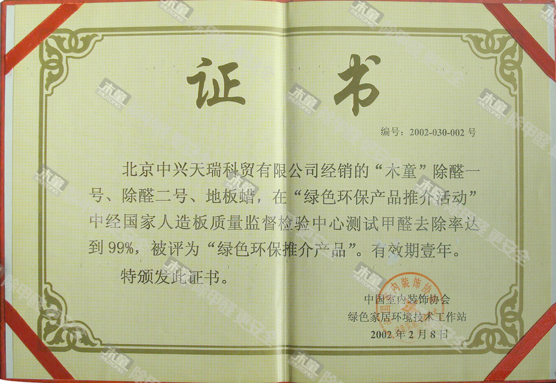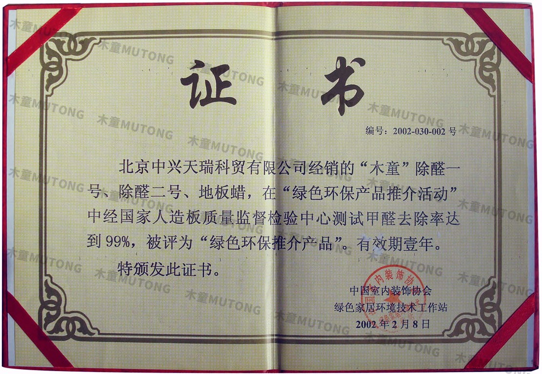 木童除甲醛一號二號、地板除甲醛蠟獲2002年綠色環(huán)保推介產(chǎn)品證書