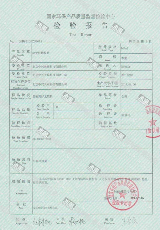 木童除甲醛地板蠟檢測報告
