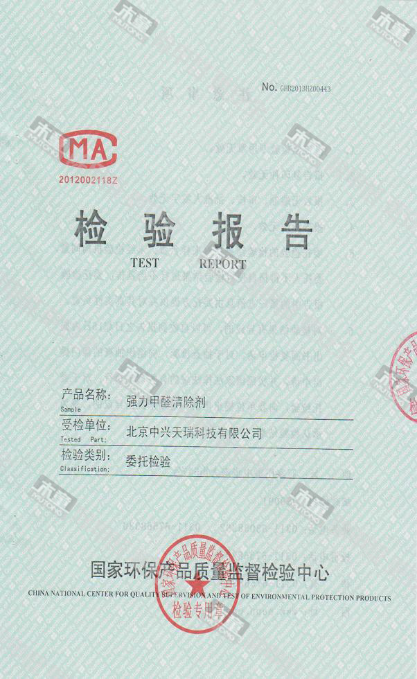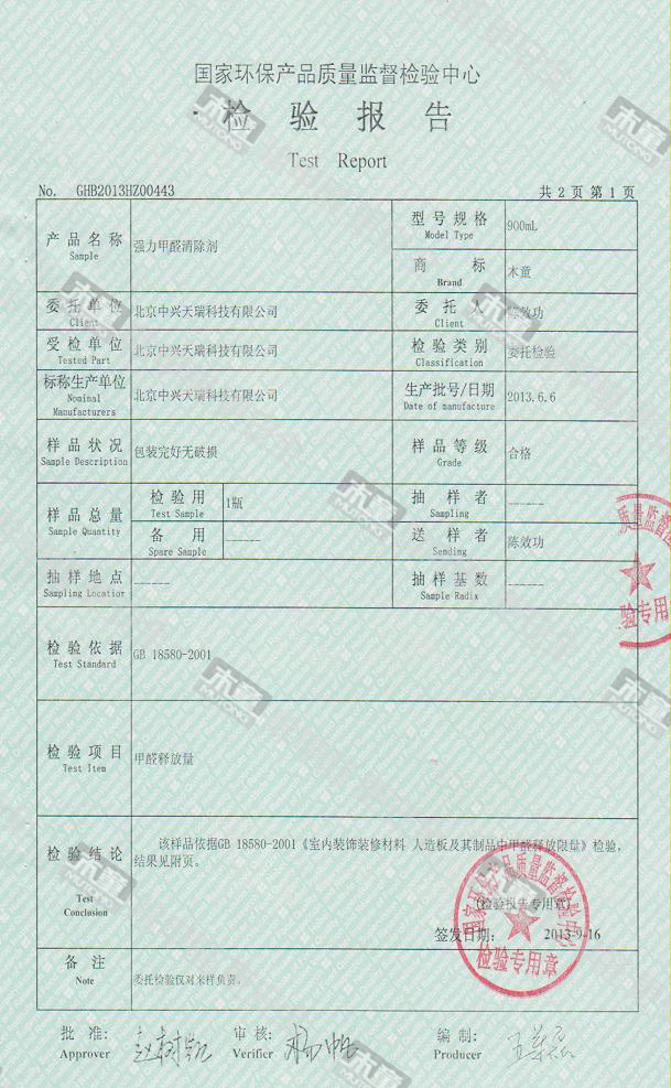 木童除醛2號三代效果檢驗報告2013